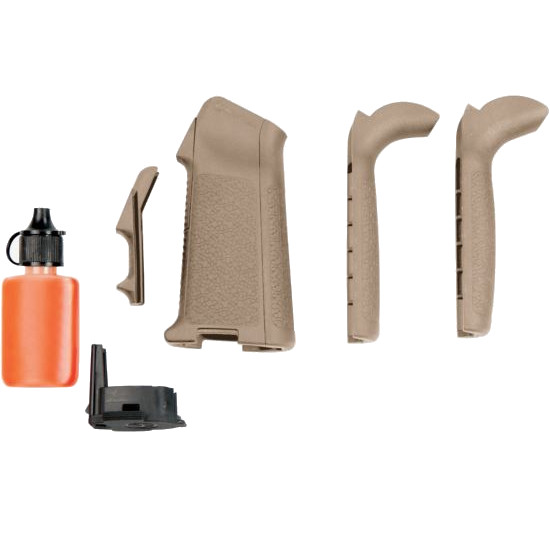 The MIAD TYPE 1 grip kit lets the user customize their grip size and profile for optimized comfort, control, and trigger finger placement. It includes three backstraps, including beavertail and no-beavertail options, and two frontstraps to allow the shooter to achieve a truly custom fit for this vital interface with their firearm. It also includes MIAD/MOE Lube Bottle Core and accepts other Magpul Storage Cores. The MIAD TYPE 1 is optimized for AR15-pattern firearms but can also be used on many AR10-pattern firearms.